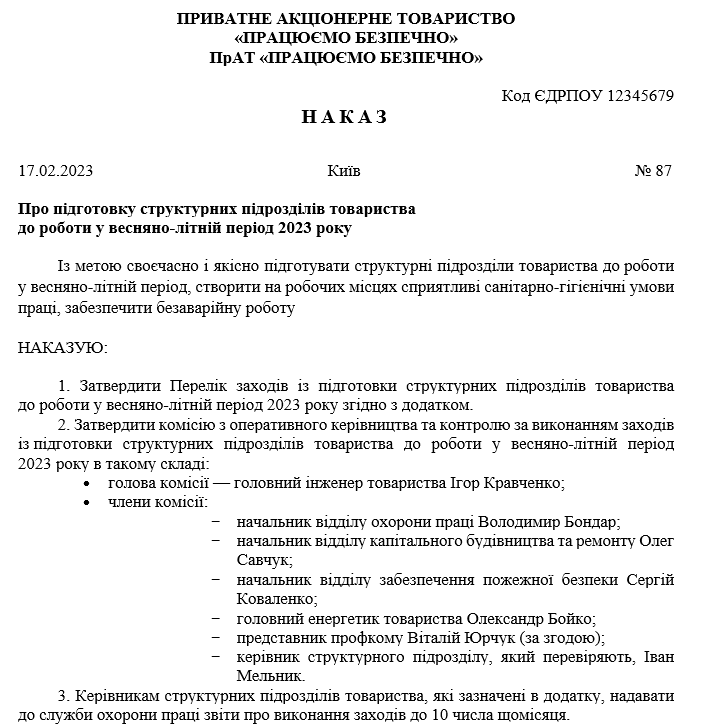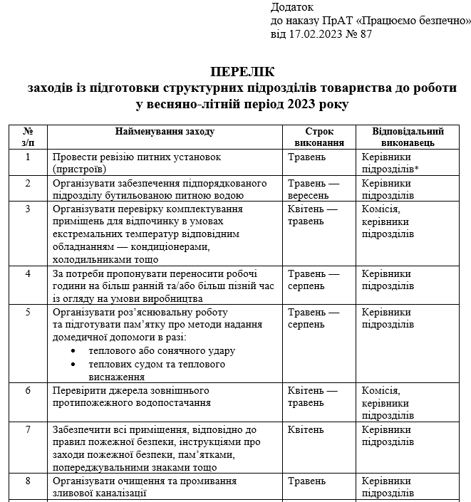 - затвердьте перелік заходів з підготовки структурних підрозділів підприємства до роботи у весняно-літній період;