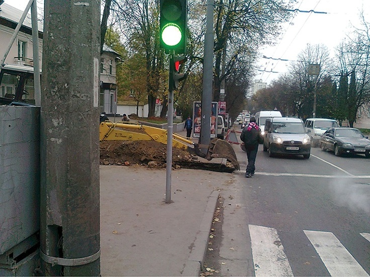 Порушення. З обох боків виритої траншеї не встановлені захисні огородження. З одного боку проїзної частини дороги є лише дорожні попереджувальні знаки. Вони призначені для водіїв транспортних засобів, що безперервним потоком рухаються вулицею.