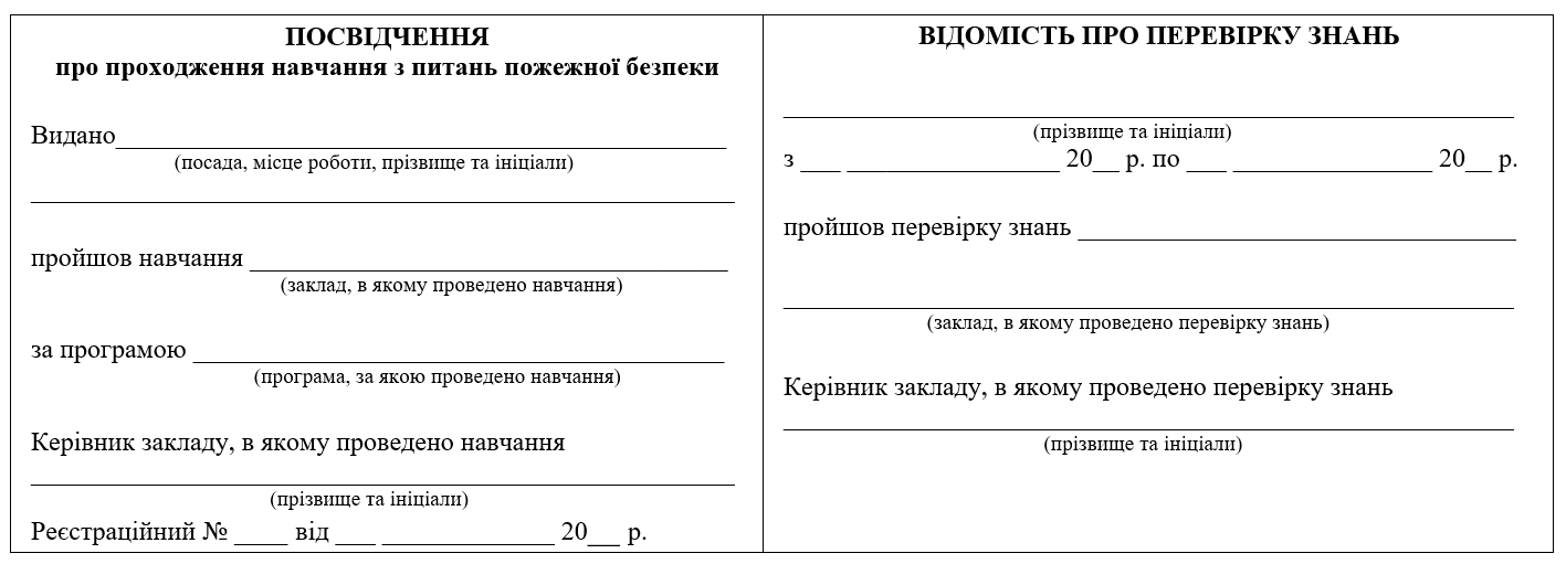 Якщо працівник (посадова особа) успішно пройшов перевірку знань, суб’єкт, який навчає, видає йому Посвідчення про проходження навчання з питань пожежної безпеки: