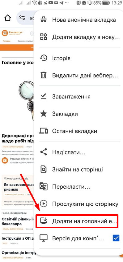 Додайте на екран мобільного телефону ярлик системи «Експертус Охорона праці». Для цього знайдіть у смартфоні Експертус Охорона праці через пошукову систему Google, увійдіть у свій акаунт і натисніть на три крапочки: