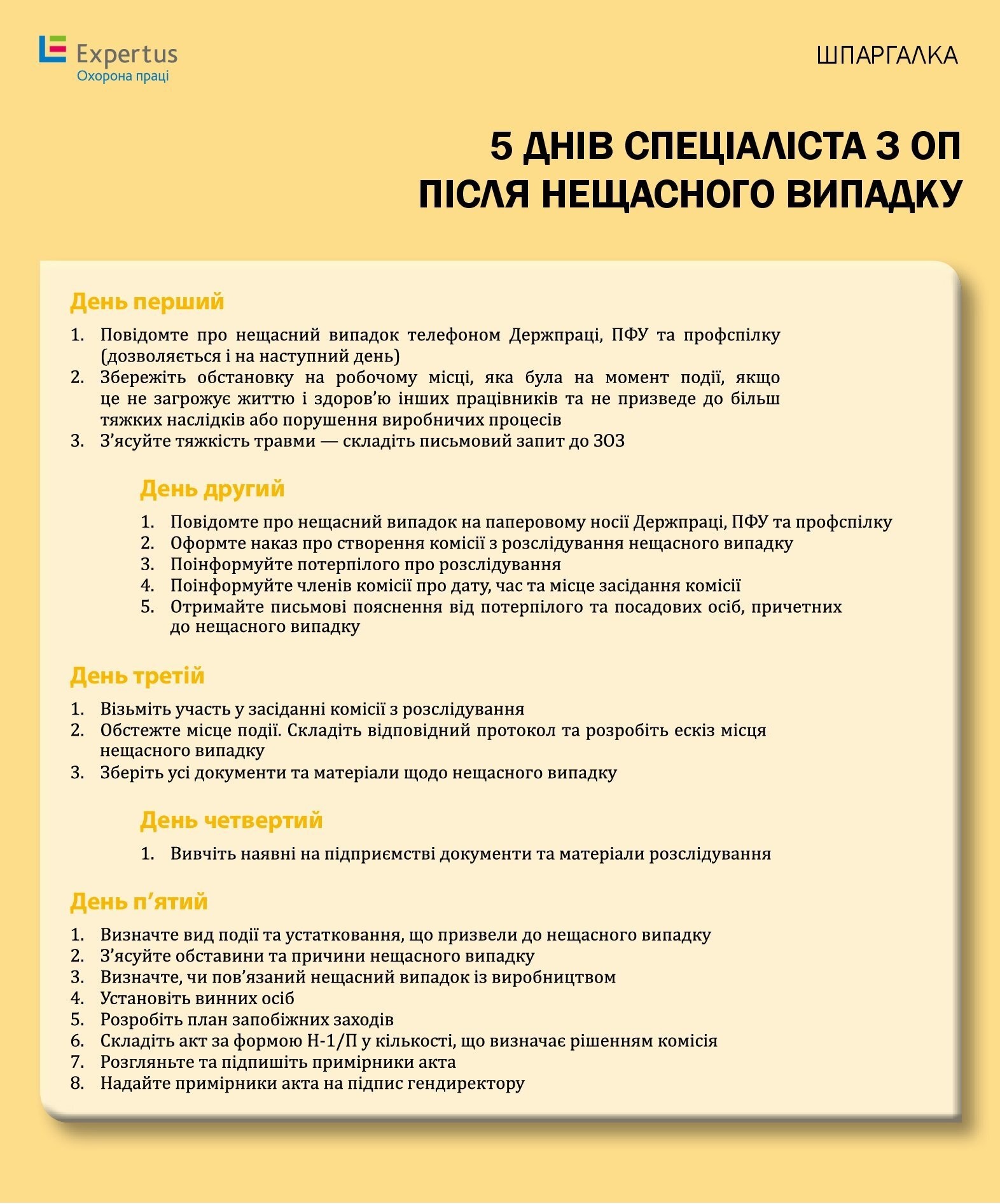 Шпаргалка. 5 днів спеціаліста з ОП після нещасного випадку