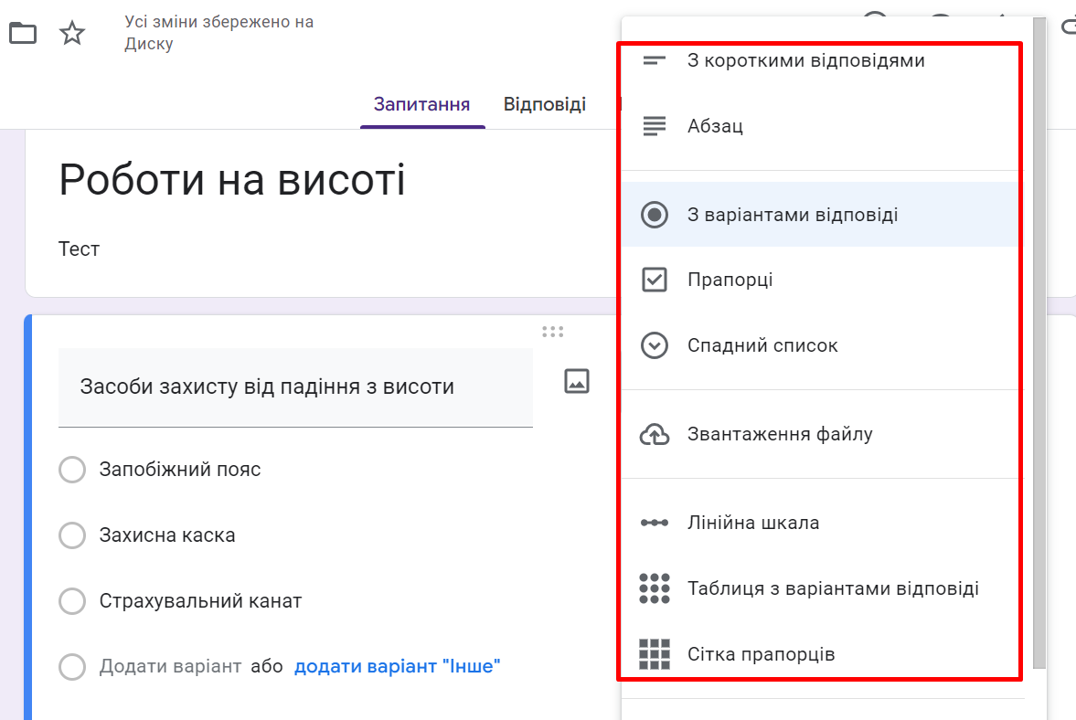 5. Зверніть увагу на типи відповідей і виберіть той, що вам потрібен. Наприклад: