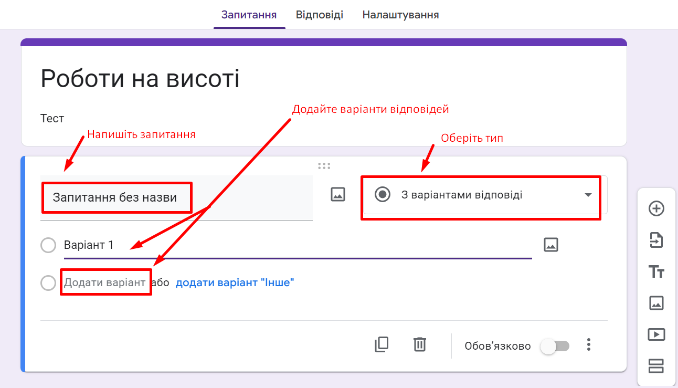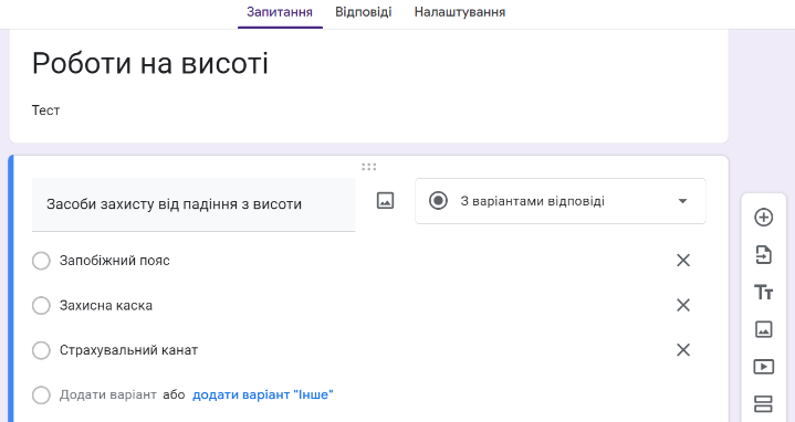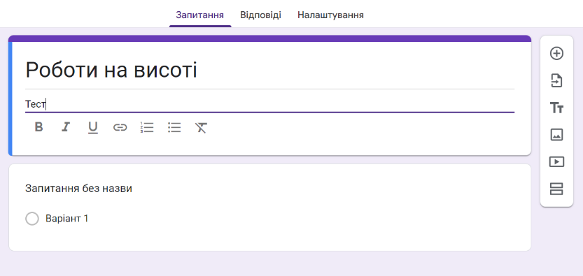 3. Впишіть назву тесту та його опис. Наприклад, «Роботи на висоті».