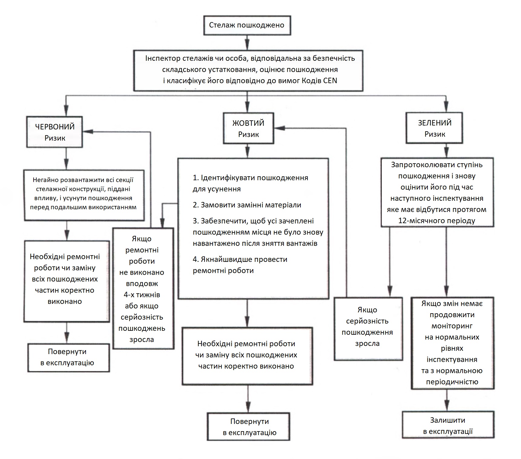 Схему наведено відповідно до пункту 9.7.3 ДСТУ EN 15635:2016 «Системи складські стаціонарні сталеві. Експлуатування та технічне обслуговування складського устатковання» (EN 15635:2008, IDT).