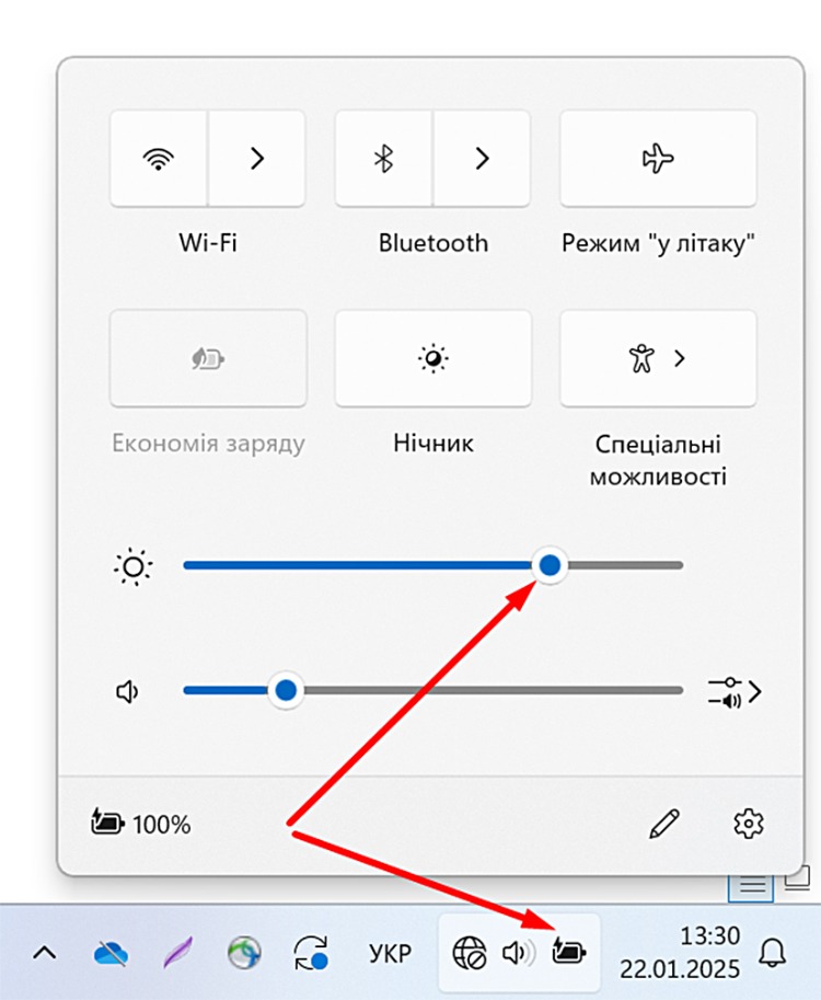 Клацніть на піктограму акумулятора в правій частині панелі завдань. Перемістіть повзунок яскравості, щоб налаштувати її (рис. 1).