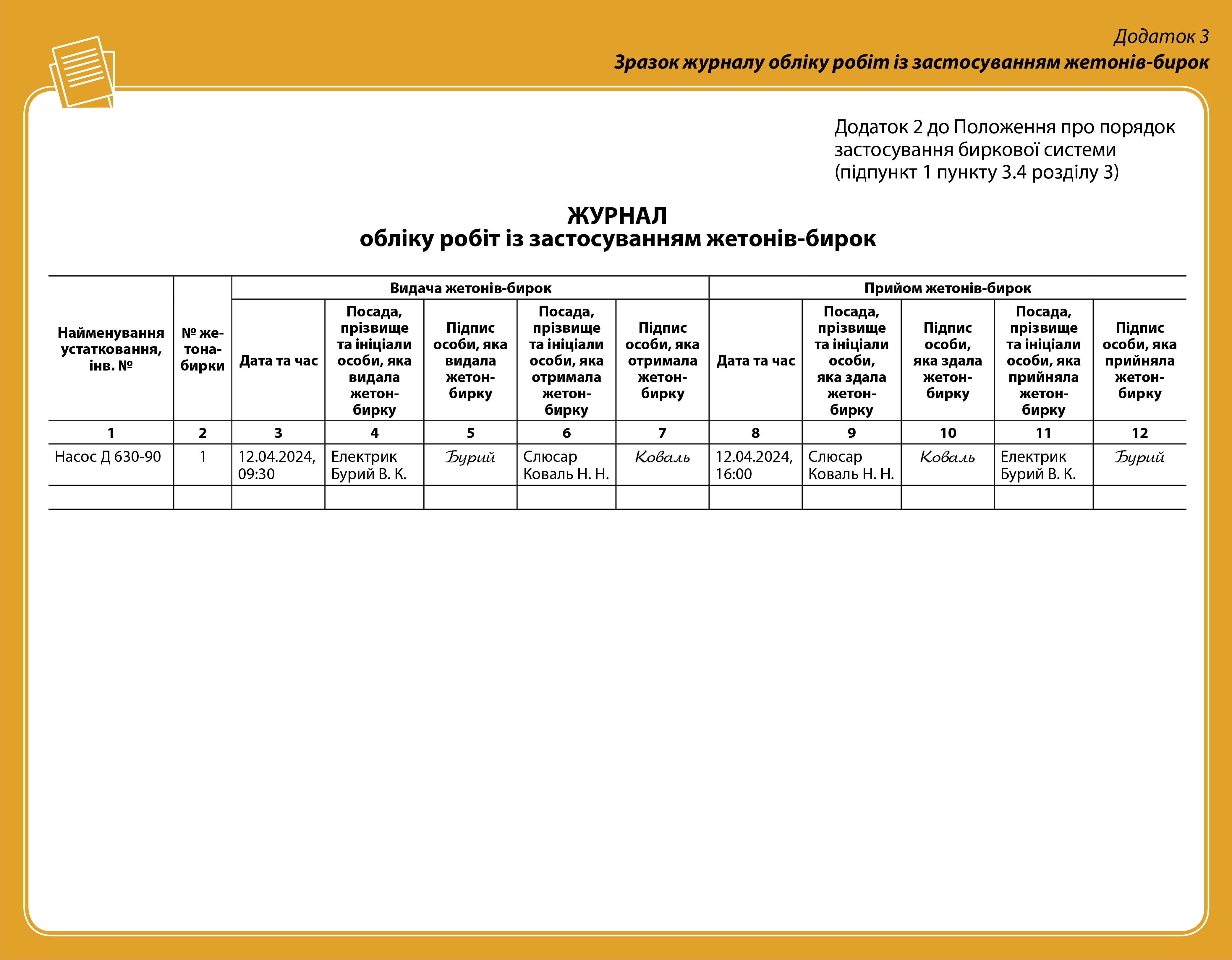 - Журнал обліку робіт із застосуванням жетонів-бирок (див. Додаток 3).