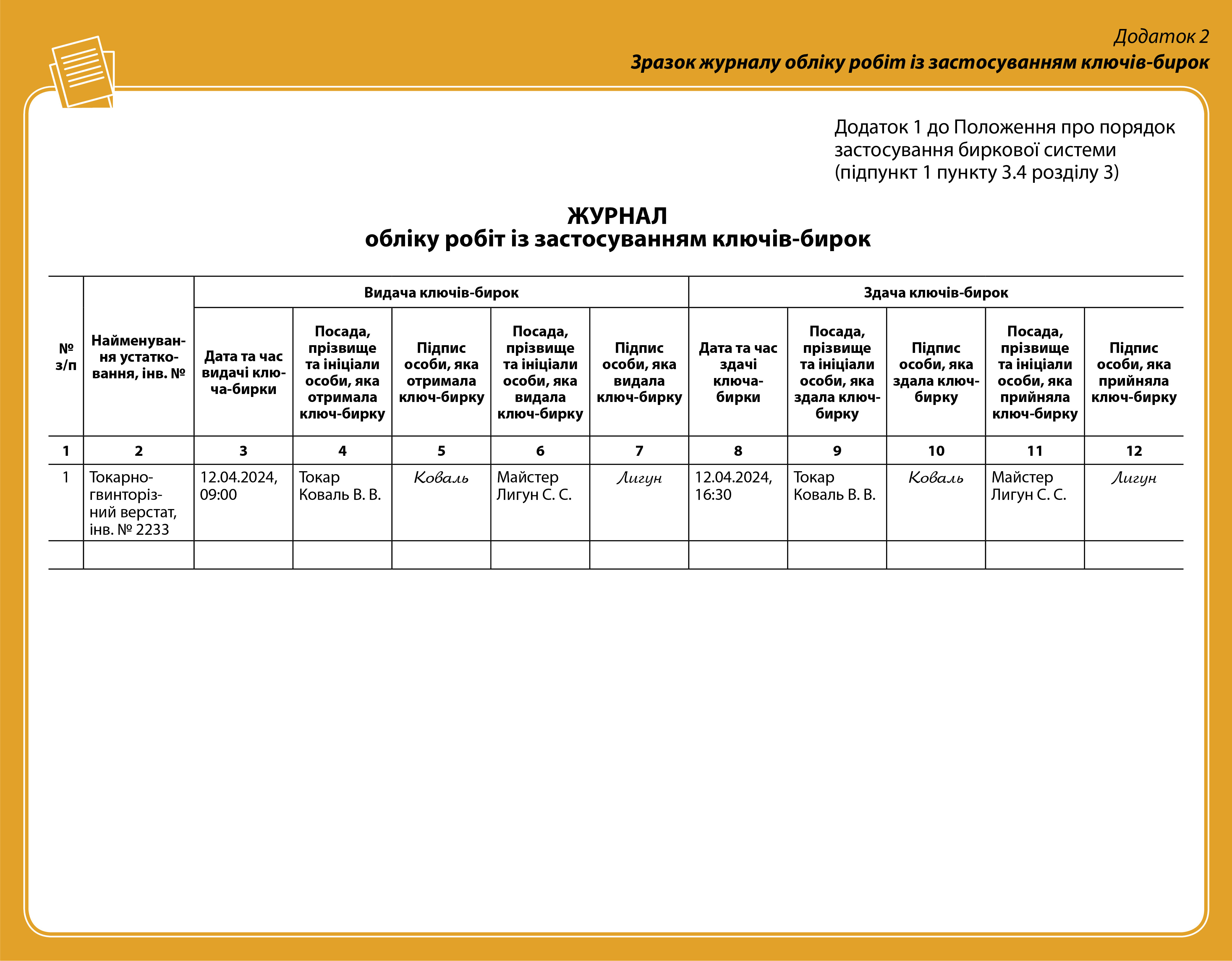 - Журнал обліку робіт із застосуванням ключів-бирок (див. Додаток 2);